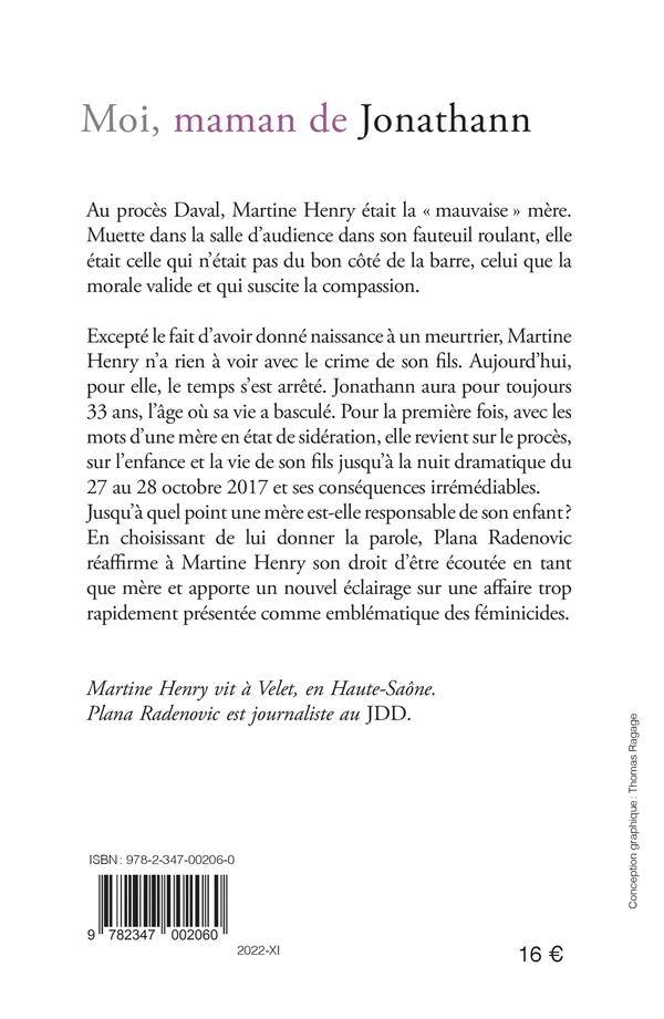 Pour la première fois avec les mots dune mère en état de sidération elle revient sur le procès sur lenfance et. Pour la première fois avec les mots dune mère en état de sidération elle revient sur le procès sur lenfance et la vie de son. Martine Henry est la mère de Jonathann Daval et cinq ans après le meurtre dAlexia elle a souhaité exprimer sa version de laffaire dans un livre Moi maman de Jonathann. Jonathann aura pour toujours 33 ans lâge où sa vie a basculé.